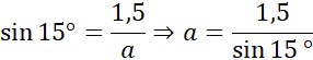 Oznacz wysokość ściany bocznej jako h. Zauważ, że powstał trójkąt prostokątny o kącie 15˚, przyprostokątnych h i 1,5 oraz przeciwprostokątnej a. Sinusem kąta α nazywamy stosunek długości przyprostokątnej leżącej naprzeciw kąta α do długości przeciwprostokątnej.