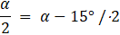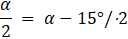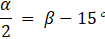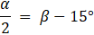 Dane są kąty wierzchołkowe α i β. Połowa kąta α jest o 15° mniejsza od kąta β. Podaj miarę kąta α.