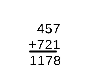 Dodaj liczby do siebie, by dostać liczbę o 457 większą od 721. Wykonując dodawanie pisemne najpierw, należy w słupku dodać do siebie cyfry jedności. Jeśli otrzymana liczba jest dwucyfrowa, należy cyfrę jedności takiego wyniku zapisać pod słupkiem cyfr jedności, a cyfrę dziesiątek z wyniku trzeba przenieść dalej poprzez dopisanie tej cyfry nad kolejnym w lewo słupkiem, czyli słupkiem cyfr dziesiątek. Przy dodawaniu kolejnego słupka, do wyniku należy dodać przeniesioną cyfrę ze słupka wcześniej. W taki sam sposób należy dodawać każdy kolejny słupek, zaczynając od lewej i idąc do prawej. Jeśli w ostatnim słupku wyjdzie liczba większa od 10, to już nie wolno przenosić dalej, bo nie ma kolejnego słupka, lecz należy napisać całą liczbę.