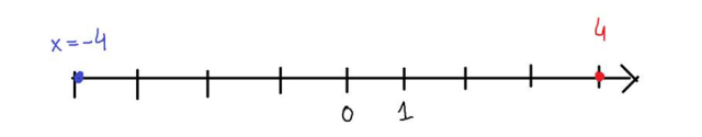 Na niebiesko zaznaczona jest liczba x = - 4, a na czerwono liczba do niej przeciwna.