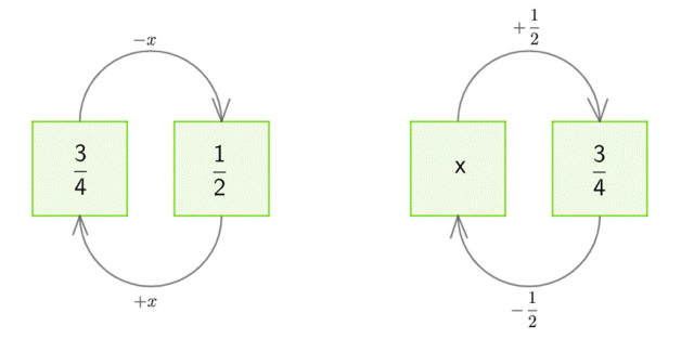 Najpierw umieść na grafie podane równanie: w pierwszym polu znajdzie się znana nam odjemna, nad strzałką należy wpisać odjemnik, czyli szukaną liczbę, a na ostatnim polu wpisz wynik. Na dolnej strzałce znajdzie się działanie przeciwne, czyli niewiadoma ze znakiem plus. Zamieniliśmy różnicę na sumę, teraz przestaw składniki (możemy to zrobić, bo dodawanie jest przemienne, czyli kolejność składników nie wpływa na wynik) i zapisz na drugim grafie to równanie: w pierwszym polu umieść niewiadomą x, nad strzałką – drugi, znany nam składnik, a w ostatnim polu – wynik. Na dole znajdzie się działanie przeciwne, czyli odejmowanie. Podążając od wyniku po strzałce, dojdziesz do wartości x.