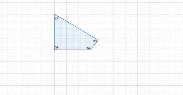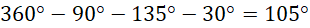 Druga ekierka na rysunku jest równoramienna, to znaczy, że ma kąty o miarach 45°, 45° i 90°. Kąt u góry wynosi 30°, ponieważ pierwsza ekierka nie jest równoramienna, dlatego jej kąty wynoszą 90°, 30° i 60°. Kąt przy dolnej podstawie tworzy z kątem drugiej ekierki kąt przyległy, a więc suma ich miar ma wynosić 180°. Dlatego wystarczy, że odejmiesz od 180° miarę kąta 45 drugiej ekierki. Suma miar kątów w czworokącie wynosi 360°, a więc odejmij od 360° miarę kąta 90°, 30° i 135°.