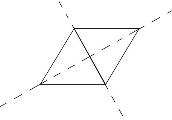 Narysuj figurę złożoną z dwóch przystających trójkątów równobocznych tak, by otrzymana figura miała dwie osie, wzdłuż których dwie połowy figury pokryją się idealnie ze sobą po złożeniu.