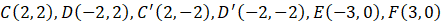 Zauważ, że szukaną figurą – częścią wspólną jest sześciokąt. Czterema z jego wierzchołków są punkty C, D, D’ i C’. Punkty C’ i D’ są obrazami punktów C(-2, 2) i D(2, 2) w symetrii względem osi OX. Dwa pozostałe punkty znajdują się na osi OX, więc ich drugie współrzędne wynoszą 0. Pierwsze z kolei są środkami odcinków AD’ oraz BC’.