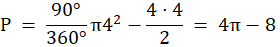 Pole zacieniowanej figury równe jest różnicy pól: wycinka koła o promieniu 4 wyznaczonego przez kąt 90° i trójkąta równoramiennego o przyprostokątnej 4.Oblicz je.