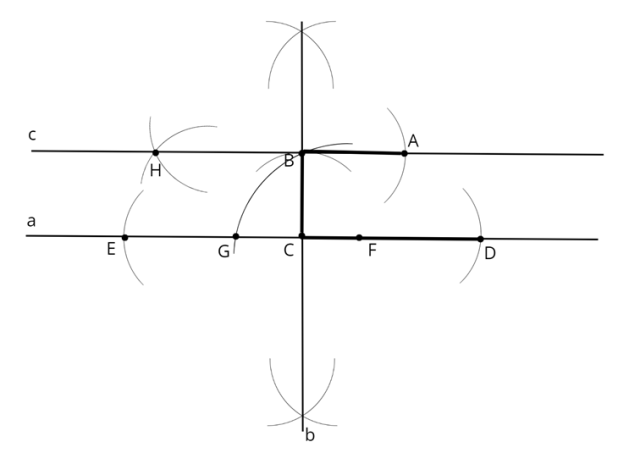 Z dowolnego punktu na prostej a (punkt F) zakreśl łuk, który będzie przecinał punkt B i prostą a. Nie zmieniając rozwartości cyrkla z punktów B i G (miejsce przecięcia łuku i prostej a) zakreśl dwa przecinające się łuki. Oznacz miejsce przecięcia się łuków jako H, następnie poprowadź prostą c przez punkty B i H.