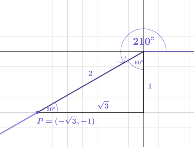 Przeanalizuj metodę przedstawioną w podręczniku. Skonstruuj trójkąt o kątach 30°, 60°, 90° w taki sposób, aby przeciwprostokątna pokrywała się z ramieniem końcowym kąta podanego w treści zadania.