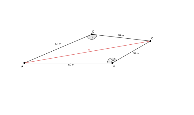 W tym zadaniu obliczyć musisz pole powierzchni działki o kształcie nieregularnego czworokąta przedstawionego na rysunku.