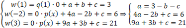jest podzielny przez wielomian trzeciego stopnia, to reszta wielomianu w jest co najmniej drugiego stopnia. Zauważ, że dla x = 3 i x = -2 to miejsca zerowe wielomianu. Po podstawieniu do wzoru na resztę (reszta jest funkcją kwadratową w tym przypadku) otrzymujemy prosty układ równań, z którego wyliczysz a, b i c reszty.