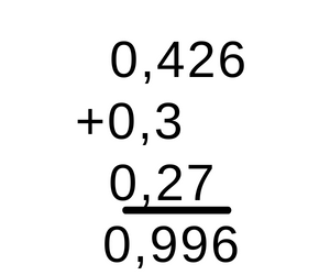 Żeby suma była mniejsza od 1, to należy wybrać trzy najmniejsze liczby. Wykonując dodawanie pisemne, najpierw należy w słupku dodać do siebie cyfry ze słupka znajdującego się najbardziej z prawej. Jeśli otrzymana liczba jest dwucyfrowa, należy cyfrę jedności takiego wyniku zapisać pod słupkiem cyfr jedności, a cyfrę dziesiątek z wyniku trzeba przenieść dalej poprzez dopisanie tej cyfry nad kolejnym w lewo słupkiem. Przy dodawaniu kolejnego słupka, do wyniku należy dodać przeniesioną cyfrę ze słupka wcześniej. W taki sam sposób należy dodawać każdy kolejny słupek, zaczynając od lewej i idąc do prawej. Jeśli w ostatnim słupku wyjdzie liczba większa od 10, to już nie wolno przenosić dalej, bo nie ma kolejnego słupka, lecz należy napisać całą liczbę. Pamiętaj, że przecinek wyniku będzie znajdował się pod przecinkami jego składników.