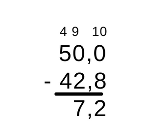 Odejmij koszt zakupów od banknotu, jakim zapłacono, by otrzymać, ile wyniosła reszta. Wykonując odejmowanie pisemne najpierw, należy odjąć cyfry w słupku najbardziej z prawej. Jeśli nie można odjąć cyfr, ponieważ odjemnik jest większy od odjemnej, to należy pożyczyć jedną dziesiątkę ze słupka z lewej strony. Wtedy odjemna w słupku, w którym wykonujemy odejmowanie stanie się o dziesięć większa, a odjemna w kolejnym na lewo słupku zmaleje o jeden. W taki sam sposób należy odejmować każdy kolejny słupek, zaczynając od prawej i idąc do lewej. Pamiętaj, że przecinek wyniku będzie znajdował się pod przecinkami liczb, jakie odejmujesz.
