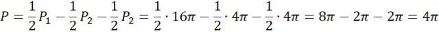 Zauważ, że figura składa się z połowy koła o promieniu 4 i wyciętych z niego połówek koła o promieniu 2. W pierwszej kolejności oblicz pola i obwody pełnych kół o tych promieniach. Skorzystaj ze wzorów