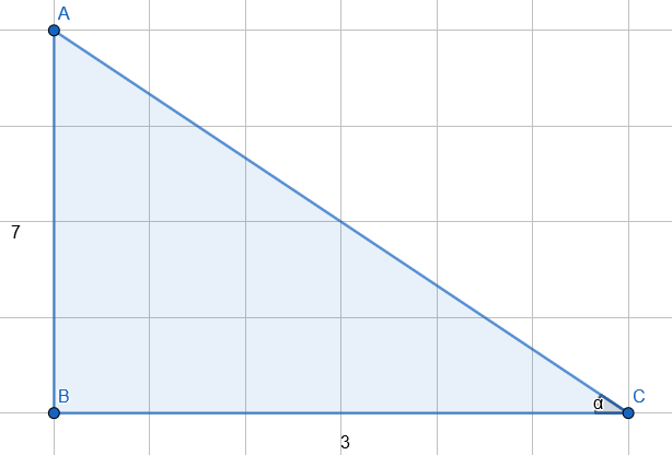 Narysuj trójkąt prostokątny z przyprostokątną przy kącie alfa równą 3 i przyprostokątna naprzeciw kąta alfa ma długość 7.