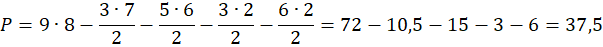 Od pola prostokąta o wymiarach 9 x 8 odejmij pole każdego z czterech trójkątów: