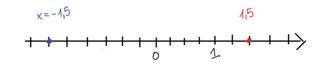 Na niebiesko zaznaczona jest liczba x = -1,5, a na czerwono liczba do niej przeciwna.
