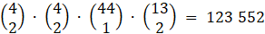 W talii są np. 4 asy. Spośród 4 kart wybierasz 2, czyli pierwszą parę, spośród 4 innych również 2, czyli drugą parę i spośród 44 pozostałych kart wybieramy 1. Takie wybieranie można zrobić na