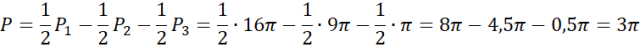 Zauważ, że figura składa się z połowy koła o promieniu 4 i wyciętych z niego połówek kół o promieniach 1 i 3. W pierwszej kolejności oblicz pola i obwody pełnych kół o tych promieniach. Skorzystaj ze wzorów