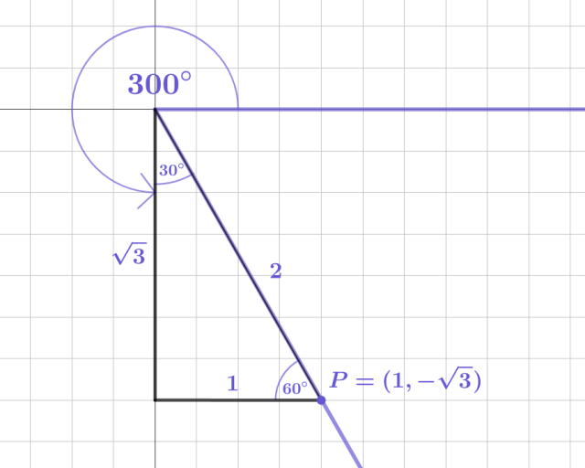 Przeanalizuj metodę przedstawioną w podręczniku. Skonstruuj trójkąt o kątach 30°, 60°, 90° w taki sposób, aby przeciwprostokątna pokrywała się z ramieniem końcowym kąta podanego w treści zadania.