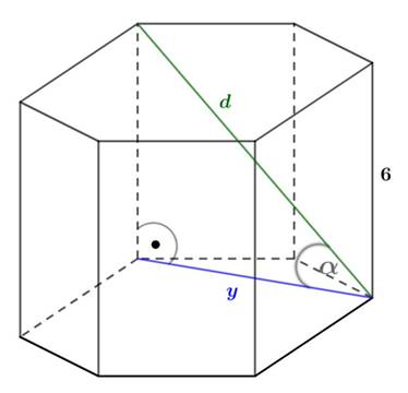 Krótszą przekątną (y) podstawy graniastosłupa oblicz z zależności trygonometrycznych w trójkącie prostokątnym. Krawędź podstawy (a) wyznacz stosując wzór