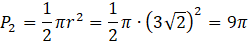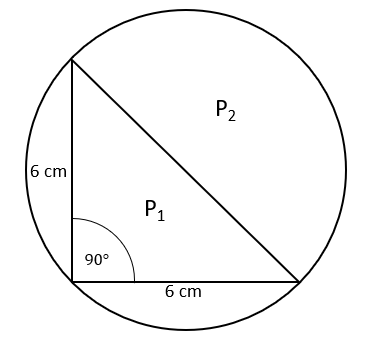 Ponieważ kąt wpisany jest kątem prosty, cięciwa, którą wyznaczają punkty przecięcia ramion kąta z okręgiem, jest średnicą koła. Szukane pole jest równe sumie pól trójkąta prostokątnego równoramiennego i półkola. Pole trójkąta możesz obliczyć jako pole kwadratu o boku 6 cm, natomiast pole okręgu oblicz korzystając ze wzoru