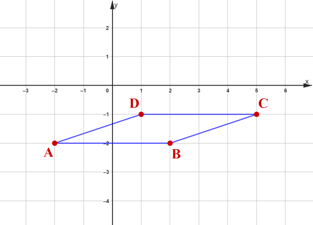 W tym zadaniu musisz podać współrzędne punktu D, Skoro ABCD tworzą równoległobok, A = ( -2, -2 ), B = ( 2, -2 ), C = (5, 1).