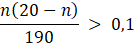 Przyjmij oznaczenie n – liczba dobrych żarówek. Wówczas liczba wadliwych żarówek to 20 - n. Dowolne dwie żarówki możesz wybrać na 190 sposobów. Wiedząc, że prawdopodobieństwo danego zdarzenia jest większe niż 0,1, podstaw dane do nierówności, rozwiąż ją i wybierz wynik, który spełnia założenia zadania, czyli