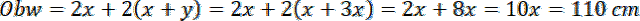 Obwód prostokąta wynosi 110 cm. Dwusieczna jednego z kątów prostokąta dzieli obwód na dwie części stosunku 1 : 4. Dwusieczna kąta dzieli dany kąt na dwa o równej mierze. W przypadku prostokąta będzie to