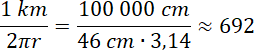 Ile obrotów wykonuje koło o średnicy 46 cm, toczące się po drodze o długości 1 km? Drogę musisz podzielić przez obwód koła, aby obliczyć, ile obrotów jest potrzebnych. π przybliż jako 3,14.