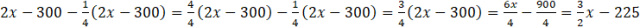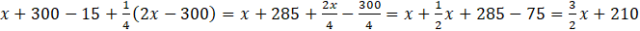 Najpierw musisz oznaczyć początkową ilość pieniędzy w lewej kieszeni jako x, a w prawej jako 2x, ponieważ jest ich dwa razy więcej. Wiemy, że w poniedziałek Pan de Fraudant przełożył do lewej kieszeni 300€ z prawej, więc dodajemy do lewej kieszeni 300, a od prawej odejmujemy 300. Wiemy również, że we wtorek zapłacił pieniędzmi z lewej kieszeni kwotę wynoszącą 15€ i przełożył czwartą część pieniędzy z prawej kieszeni do lewej, więc tylko od lewej kieszeni odejmujemy 15 i dodajemy do lewej kieszeni