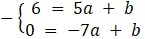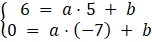 . Podstawiamy współrzędne punktów do równania prostej i zapisujemy układ równań, który rozwiązujemy, aby obliczyć współczynniki a i b tej prostej: