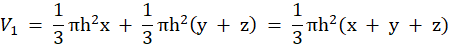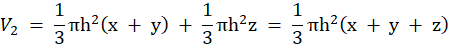 Zauważ, że objętość pierwszej bryły jest równa sumie objętości 2 stożków: 1 o promieniu podstawy h i wysokości x, a 2 o promieniu podstawy h i wysokości y + z