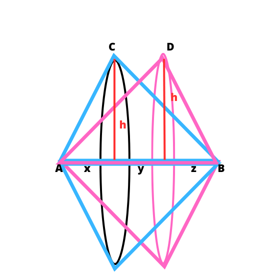W tym zadaniu musisz wykazać, że objętości brył otrzymanych w wyniku obrotu trójkątów wokół prostej AB są równe, wiedząc, że trójkąty na rysunku mają równe wysokości.