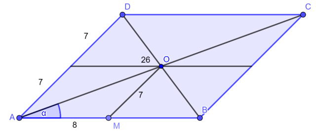 Punkt M jest rzutem punktu O (środek równoległoboku). Z tego wynika, że punkt M jest środkiem boku AB.