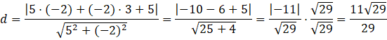 Teraz wystarczy, że odczytasz poszczególne współczynniki z równania, i podstawisz je do wzoru, razem z współrzędnymi punktu C.