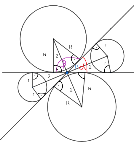 Dwie proste przecinają się w punkcie P pod kątem 60° i dzielą płaszczyznę na 4 części. W każdej z tych części znajduje się okrąg styczny do obu prostych, którego środek jest odległy od punktu P o 2 cm. Wyznacz promienie tych okręgów.