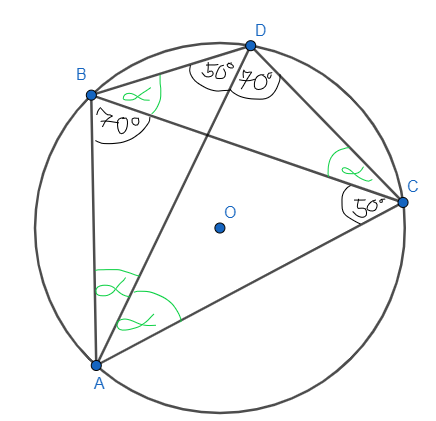 Na okręgu o środku O wybrane zostały punkty A, B i C. Dwusieczna kąta CAB przecina okrąg w punkcie D. Oblicz miary kątów wewnętrznych czworokąta ABCD, przy założeniu, że kąt ABC wynosi 70°, a kąt BCA wynosi 50°.