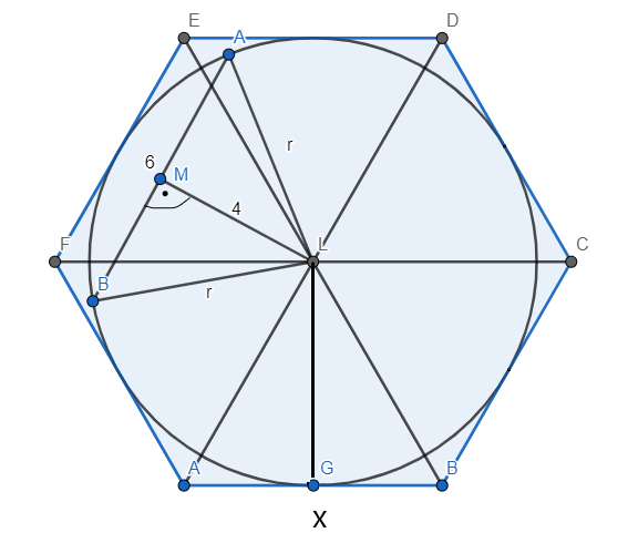 Przyjmij oznaczenia jak na rysunku. Zacznij od obliczenia długości promienia r z twierdzenia Pitagorasa w trójkącie MAL. Zauważ, że promień r jest wysokością trójkąta równobocznego o boku długości x. Znając długość r oblicz x. Na koniec oblicz pole sześciokąta.