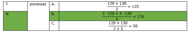 Skoczek narciarski oddał pięć skoków. Średnia długość pierwszych dwóch skoków wynosiła 120 m, a średnia długość trzech pozostałych skoków wynosiła 130 m. Czy średnia długość wszystkich pięciu skoków wynosi 125 m? Wybierz odpowiedź T (tak) lub N (Nie) i jej uzasadnienie spośród zdań A – C.