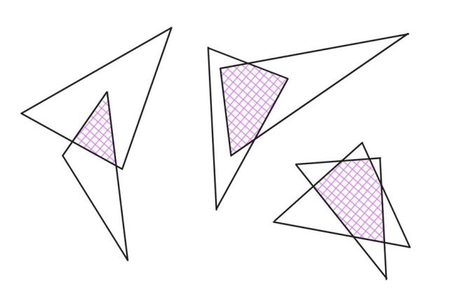 Przykłady trójkątów, które tworzą na przecięciu figur kolejno: trójkąt, pięciokąt i sześciokąt.