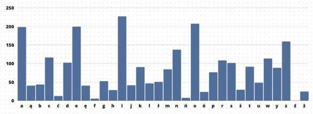W tym zadaniu musisz wykonać diagram słupkowy obrazujący częstotliwość występowania liter w 72 początkowych wersach Pana Tadeusza Adama Mickiewicza.