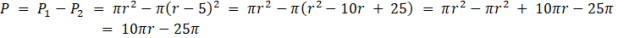Zauważ, że pole pierścienia jest równe różnicy pól dwóch kół o promieniach r i r-5