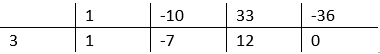 Skorzystaj ze schematu Hornera. Narysuj tabelę. W pierwszym wierszu wpisz wszystkie kolejne współczynniki uporządkowanego równania. W lewym dolnym rogu najniższego wiersza tabelki wpisz liczbę, która jest jego jednym z rozwiązań, czyli 3. Przepisz pierwszy współczynnik bez zmian do dolnego wiersza. Tak otrzymaną liczbę 1 pomnóż przez liczbę 3, następnie dodaj liczbę -10. Wynik będący liczbą -7 wpisz do kolejnej komórki dolnego wiersza w schemacie Hornera. Podobnie postępuj z kolejnymi współczynnikami wielomianu.