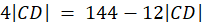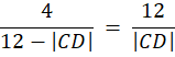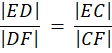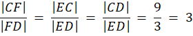 Wyznacz stosunek długość odcinków CF i FD, wiedząc, że w trójkącie ABC, którego boki wynoszą |AC| = |BC| = 12 i |AB| = 4, dwusieczna kąta przy wierzchołku A przecina bok BC w punkcie D, przez który poprowadzona została równoległa do prostej AB, która przecina bok AC w punkcie E. Punkt F jest punktem wspólnym boku BC i dwusieczna kąta DEC.