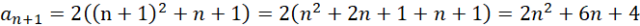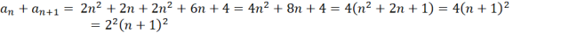 Wyznaczamy, że wzoru rekurencyjnego wyraz o indeksie n + 1, a następnie dodajemy do siebie wzory obu z nich. Otrzymujemy postać kwadratu liczby n + 1 powiększoną czterokrotnie.