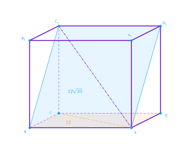 Dany jest prostopadłościan ABCDA1B1C1D1 o objętości równej 144 cm3. O figurach ABCD i ABC1D1 wiadomo, że ich pola powierzchni wynoszą odpowiednio: 12 cm2 oraz