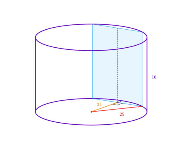 Dany jest pewien walec o promieniu podstawy 25 cm oraz wysokości 16 cm. Przez bryłę przeprowadzono płaszczyznę równoległą do przekroju osiowego bryły w odległości 24 cm od osi obrotu. Oblicz pole powstałego przekroju.