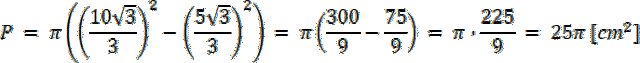 Wyznacz promienie obu okręgów, zawierają się one w wysokości trójkąta. Wyznacz pole pierścienia jako różnica pola większego okręgu i mniejszego okręgu. Wybierz poprawną odpowiedź.