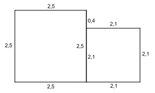 Wyznacz obwód figury przedstawionej na rysunku obok, jeśli można ją rozciąć na dwa kwadraty o polach 6,25 i 4,41.