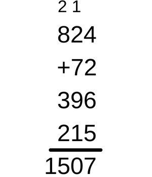 Możesz od razu dodać te cztery liczby w jednym słupku, nie musisz dodawać dwóch sum osobno i dopiero potem wyników razem, ponieważ nie zmieni to końcowej odpowiedzi. Wykonując dodawanie pisemne, najpierw należy w słupku dodać do siebie cyfry jedności. Jeśli otrzymana liczba jest dwucyfrowa, należy cyfrę jedności takiego wyniku zapisać pod słupkiem cyfr jedności, a cyfrę dziesiątek z wyniku trzeba przenieść dalej poprzez dopisanie tej cyfry nad kolejnym w lewo słupkiem, czyli słupkiem cyfr dziesiątek. Przy dodawaniu kolejnego słupka, do wyniku należy dodać przeniesioną cyfrę ze słupka wcześniej. W taki sam sposób należy dodawać każdy kolejny słupek, zaczynając od lewej i idąc do prawej. Jeśli w ostatnim słupku wyjdzie liczba większa od 10, to już nie wolno przenosić dalej, bo nie ma kolejnego słupka, lecz należy napisać całą liczbę.