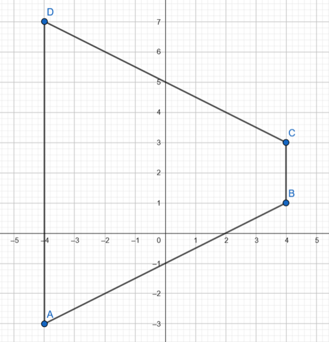 Znajdź punkt, w którym przecinają się proste zawierające ramiona trapezu o kolejnych wierzchołkach A(-4,-3), B(4,1), C(4,3) oraz D(-4,7) nie są prostopadłe.